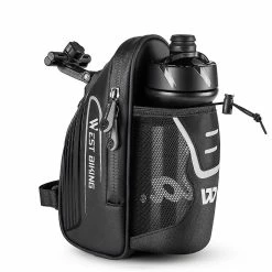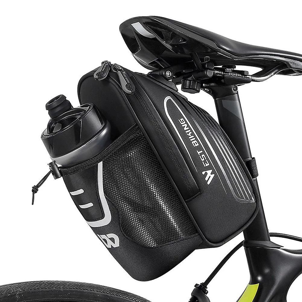 This is a kind of fine quality bike tail bag, which is made of superior tear-resistant nylon and polyester, wear-resistant and scrach-resistant, can provide long service time. Approx 1.5L large capacity, large enough to hold bicycle accessories, repairing tools, wallets, cellphones, keys, snacks, etc. There is a mesh bottle cage on the front of the bicycle bag, and elastic rope design can hold the water bottle tightly and makes it free from falling off during use. You can have a try.