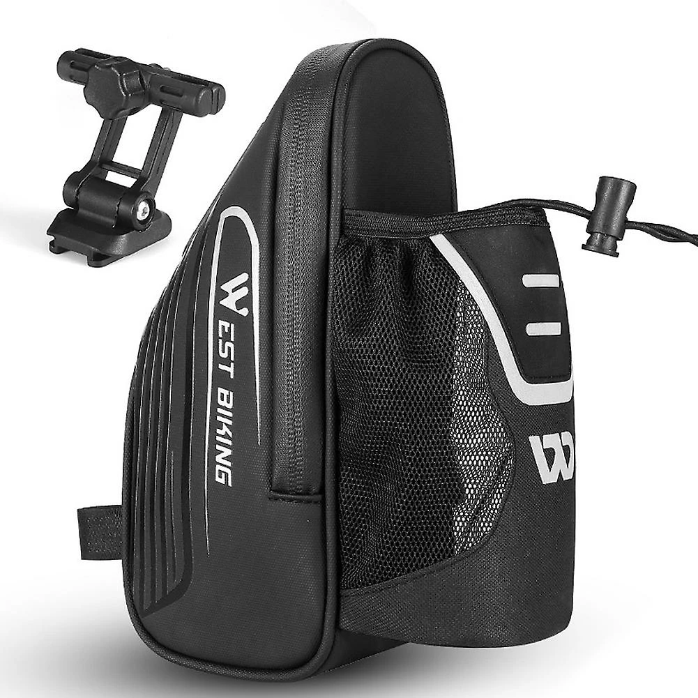 There is a mesh bottle cage on the front of the bicycle bag, and elastic rope design can hold the water bottle tightly and makes it free from falling off during use.