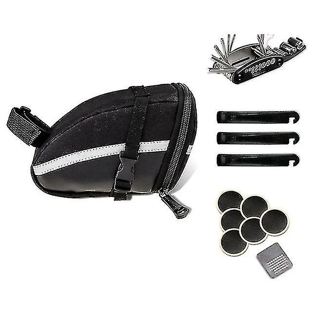 [Light and Practical Multi-Tool] 16-in-one tool, multi-purpose bicycle repair tools: hex wrench 2mm/2.5mm/3mm/4mm/5mm/6mm each; socket wrench 8mm/9mm/10mm each; One and cross screwdriver; one hex wrench 8mm/10mm/ 15mm; one 14GE rim accessory wrench; one sleeve extension rod, made of high quality alloy steel, light and compact, sturdy and durable, combination 16 kinds of bicycle common repair tools, enough to meet daily needs. [Easy to Carry and Install] Bicycle saddle bag, easy to install, easy to use, can be used to store tools and small things. [High durability] High quality stainless steel and ABS material are adopted. It is durable and very sturdy. [Special Reflective Strip, Taillight Suspension Strap Design] Professionally designed bicycle saddle bag with reflective strips on both sides and taillights can be hung at the rear to make night trip safer. Large capacity: main warehouse 12L capacity, can put repair tools, gloves, glasses and other items. Features: Ribbon fixation, simple operation, easy and convenient, easy to use Compatibility: road vehicle, mountain vehicle, city vehicle, folding vehicle, etc. easy to clean leather colour: black Material: high-density fabric + steel size: 15×10.5×7.5cm Package Contents: 3 x crowbar 6 x tire patch 1 x tyre disc 1 x 16 in one combination tool 1 x bicycle tail bag Only the above package content, other products are not included. Note: Light shooting and different displays may cause the color of the item in the picture a little different from the real thing. The measurement allowed error is +/- 1-3cm.