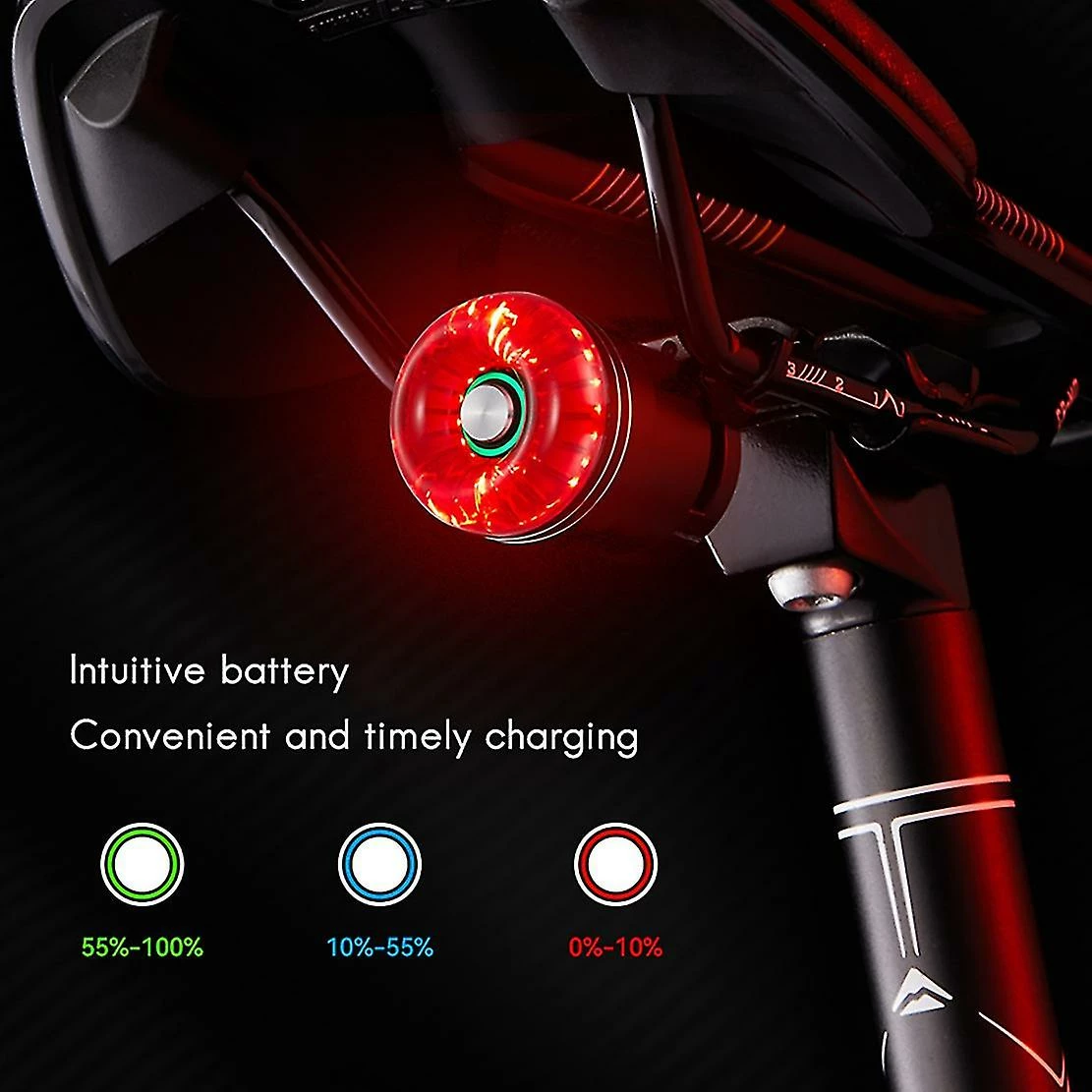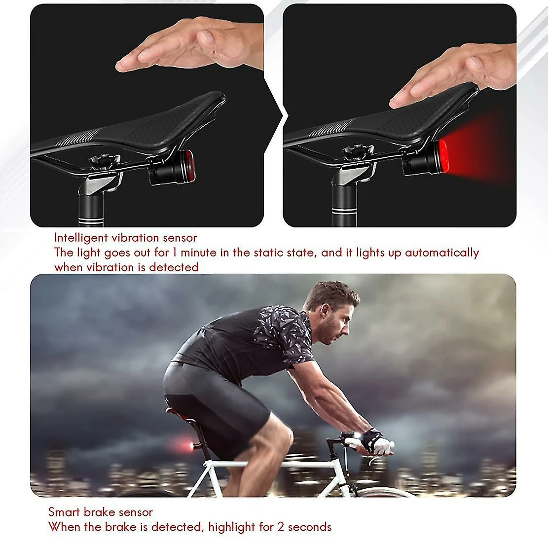 [Ultra Bright Bike Brake Taillight]A built-in integrated accelerometer ensures accurate brake detection, the rear light will automatically turn to brake modes to warn the car coming from behind when decelerating or emergency braking, great compatible with riding on nights. 4 light modes compatible with your choice: slow flash, breathing flicker, strobe mode and steady on.[Save Your Time]The flashing light will turn on automatically in low brightness and turn off in high-intensity light in Fast Flash and Breathing mode[Saddle Fit & Tube Fit Strap-Install]smart rear light offers two different install systems- Saddle fit aluminum alloy system and tube fit straps, whatever you want to put on-saddle or tubes, bicycle or helmet, easily to install in seconds without any tools[USB Rechargeable Long Llife Battery]Built in 350mAh Polymer lithium battery and Energy-saving designs, the rear bike light run time can be up to 45 hours. The taillight can be easily charged by charging cable via computers, chargers or power bank.[IPX6 Waterproof & Shock Resistant]Rear light cover with anybody aluminum alloy case, not worry about the light will get wet by rain. Has excellent vibration resistance, can be used compatible with any terrain ( Tips: Please turn the light mode to the steady on if you wanna use it in the daytime. because This taillight has a smart light sensing function. Light intensity will be automatically dimmed under strong light to reduce the power consumption).type:AColour:RedMaterial:Aluminum alloyPackage Contents:1 x Bike Tail Light1 x usb cable2 x Mounting bracketOnly the above package content, other products are not included.Note: Light shooting and different displays may cause the color of the item in the picture a little different from the real thing. The measurement allowed error is +/- 1-3cm.